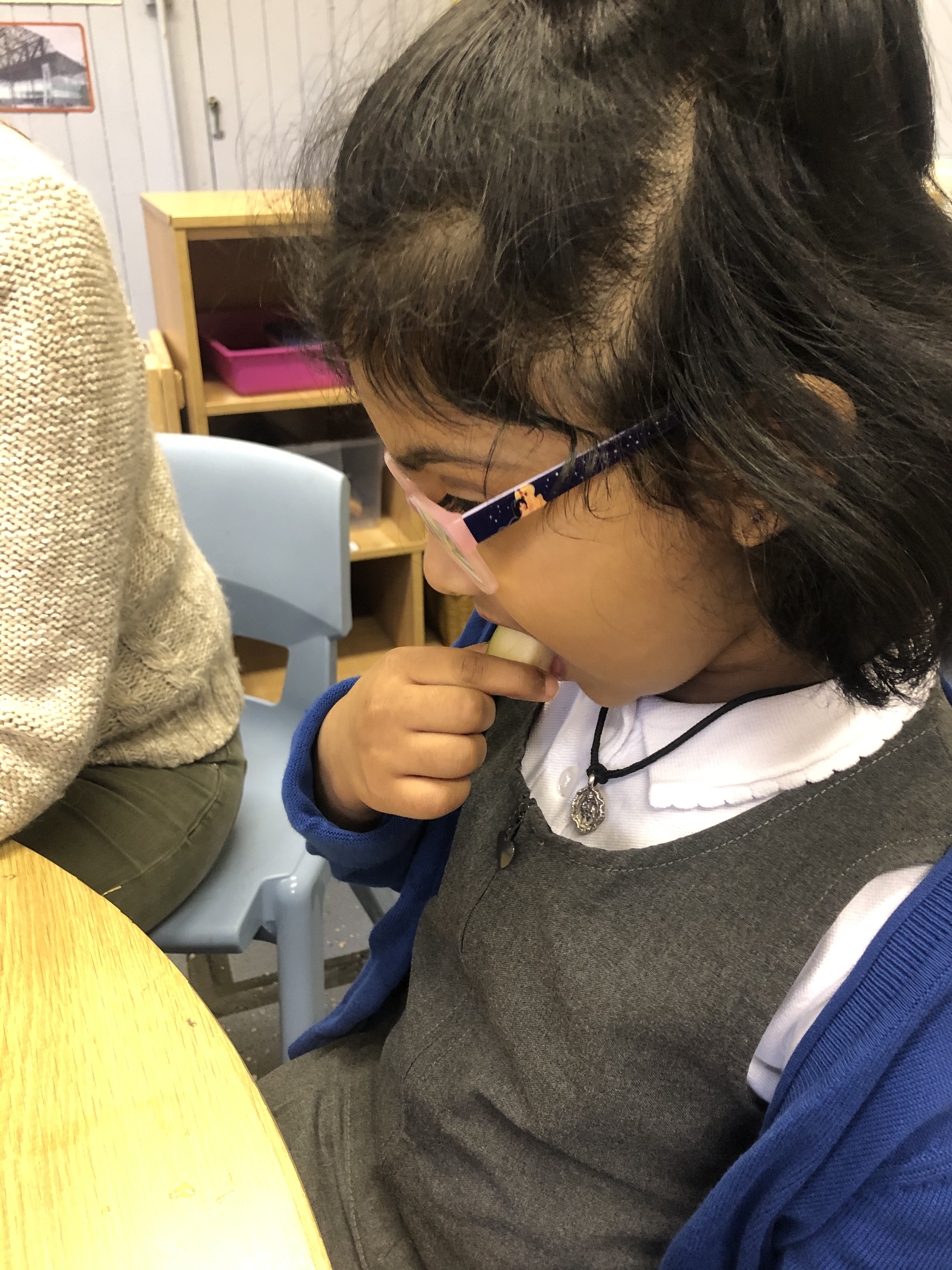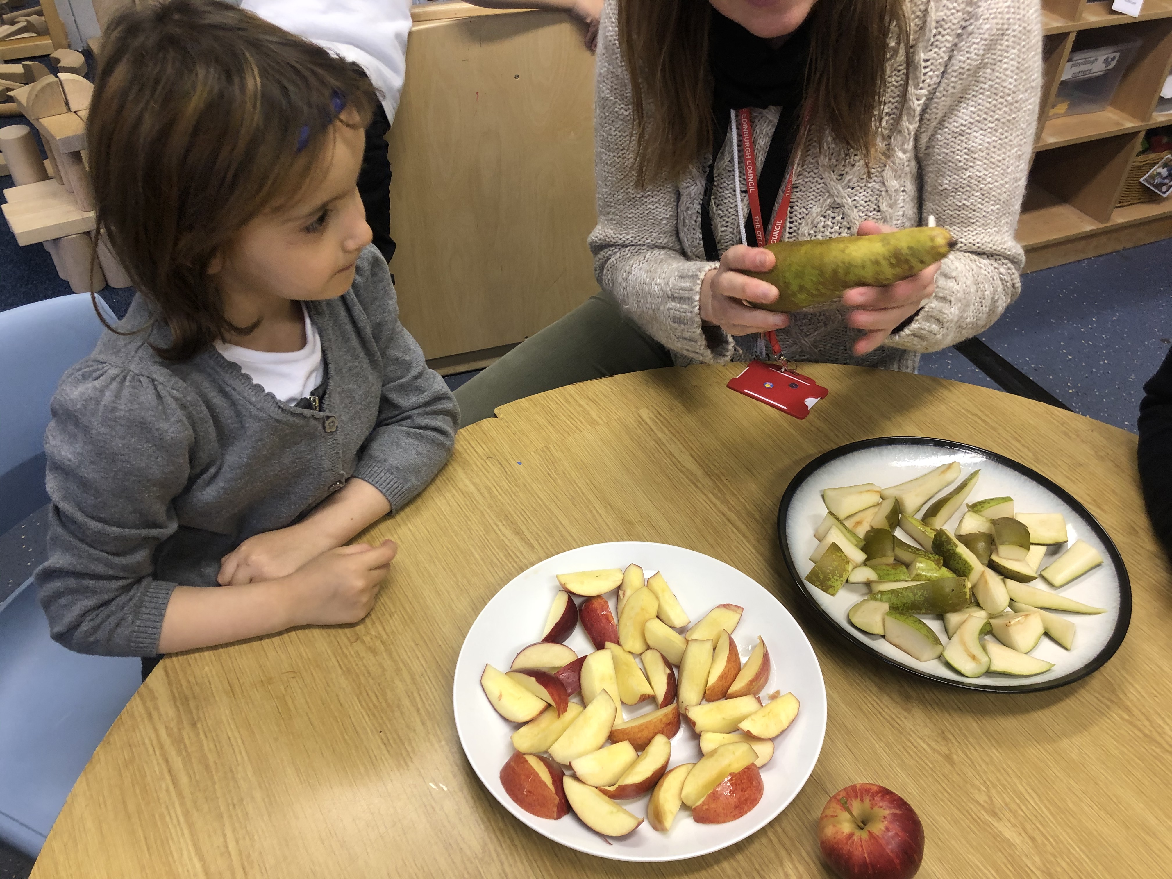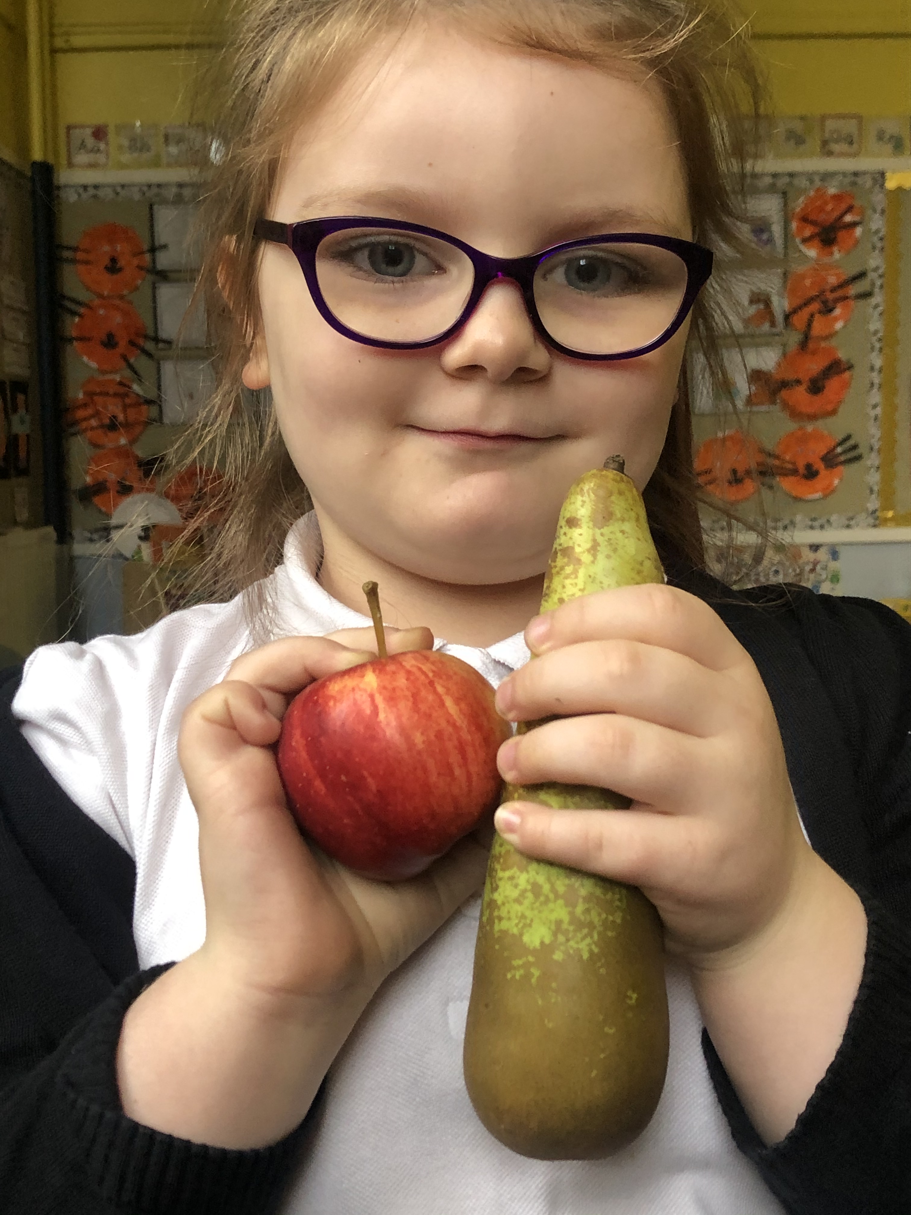 In P1/2 We enjoyed sampling some of autumns most popular foods. The children discussed harvest and tasted some lovely red apples, juicy green pears and a delicious pumpkin.