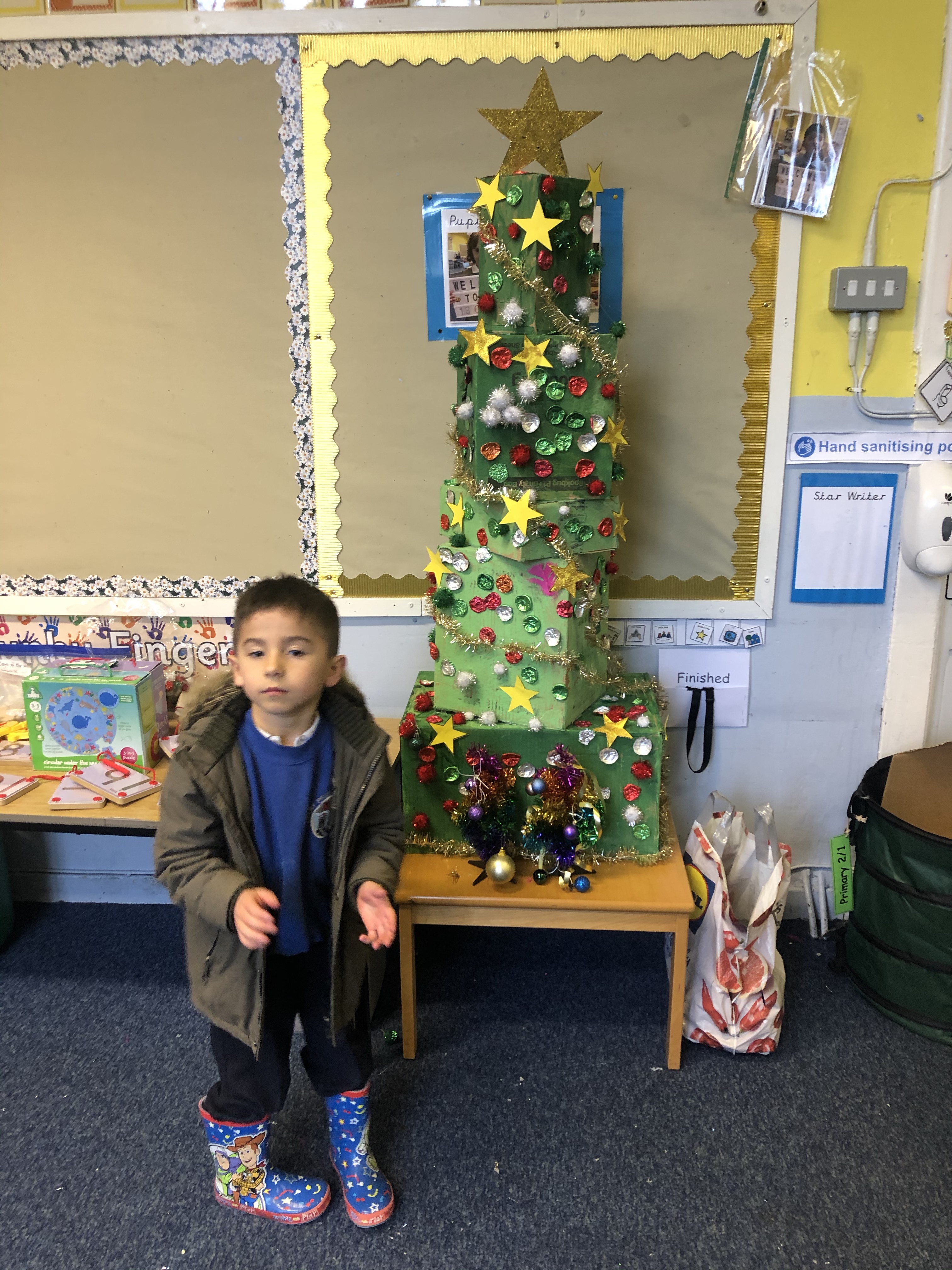We have worked hard all week preparing our classroom for Christmas. The children have been saving boxes for weeks and Ms McDermot has been collecting milk bottle tops to decorate our junk modelling tree. We applied two layers of paint before building the tree and decorating it with abandon! We hope you like it.