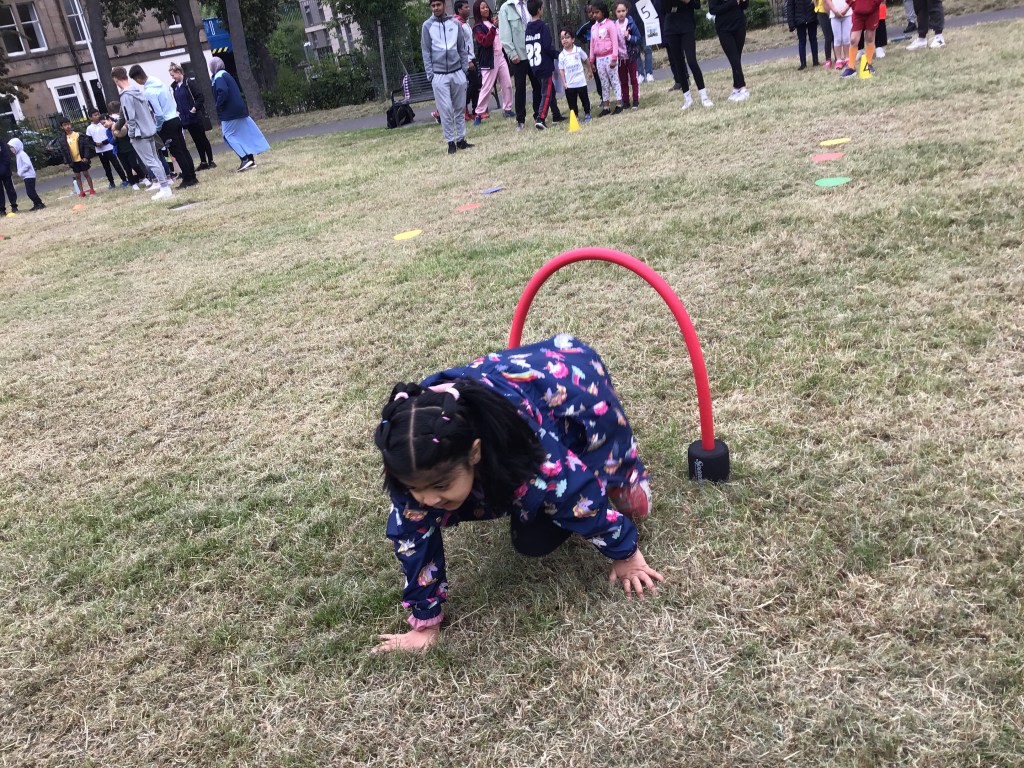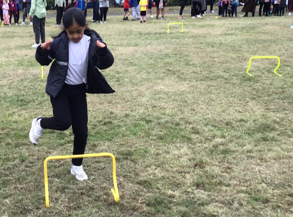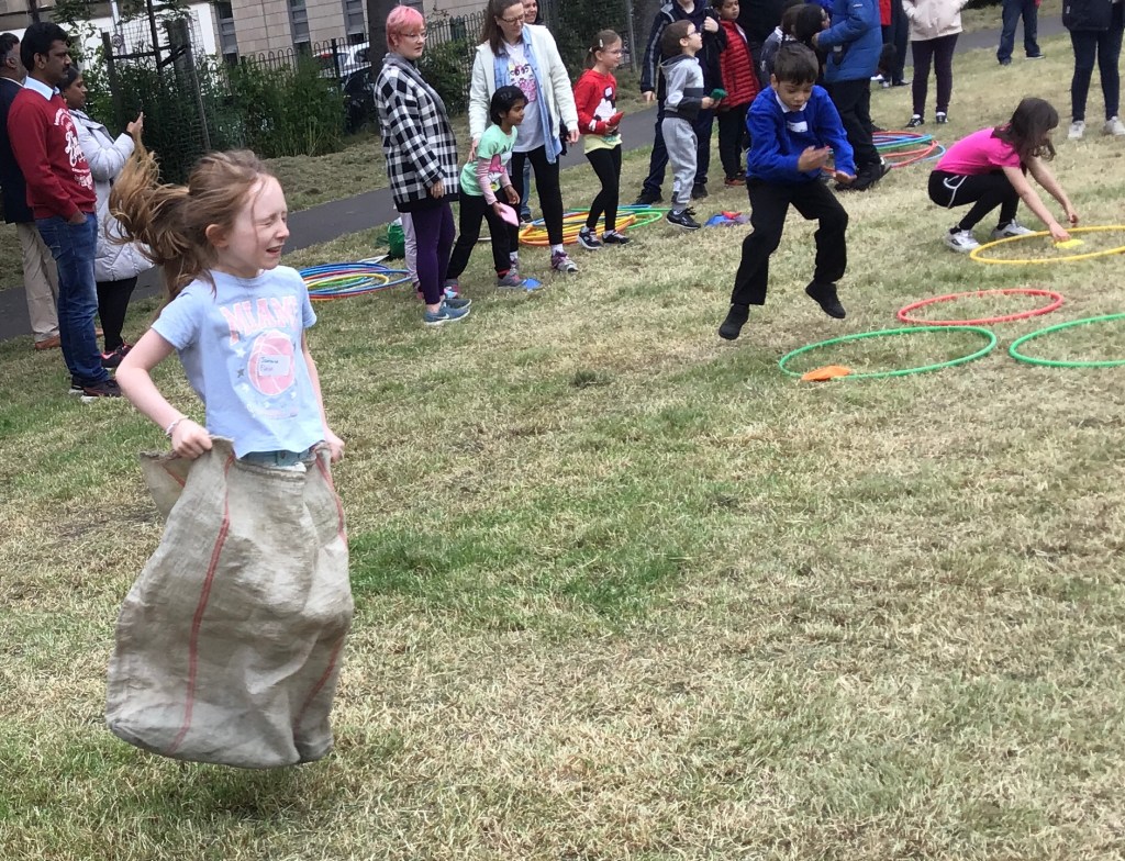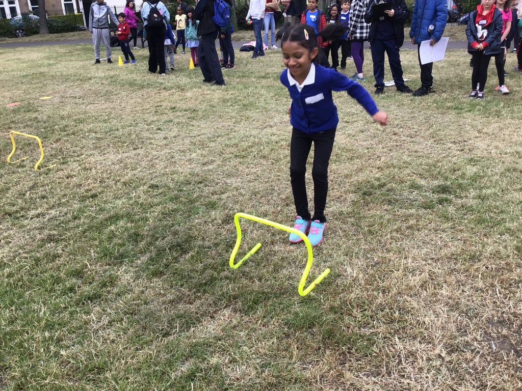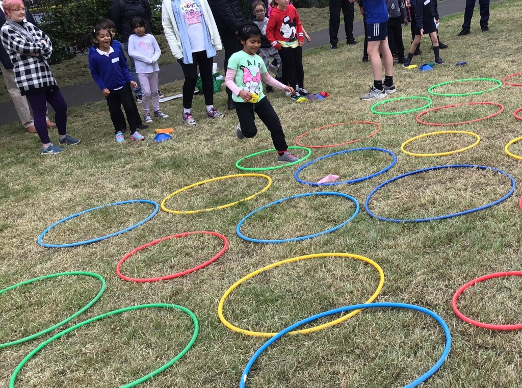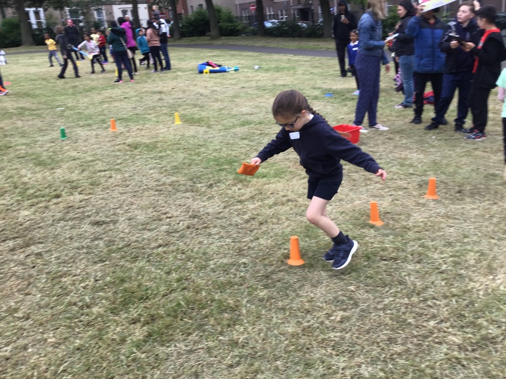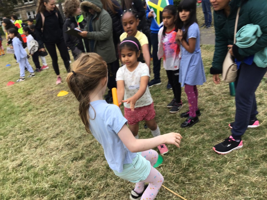 Our lower school went first split into country teams to try lots of stations with sports from football to Javelin. The sack race station was particular fun.