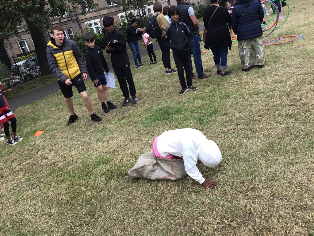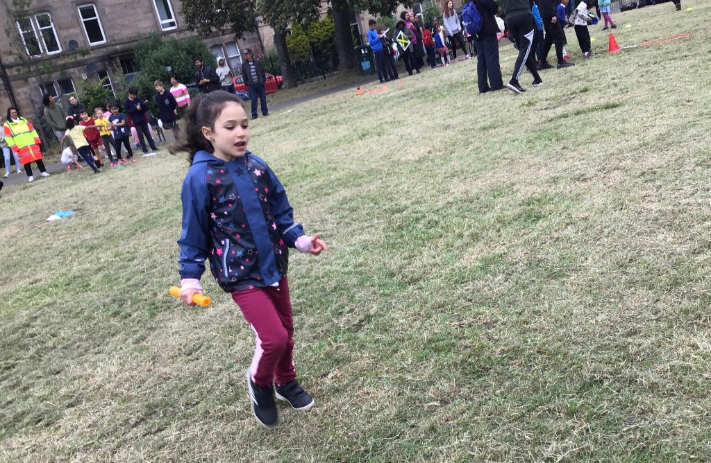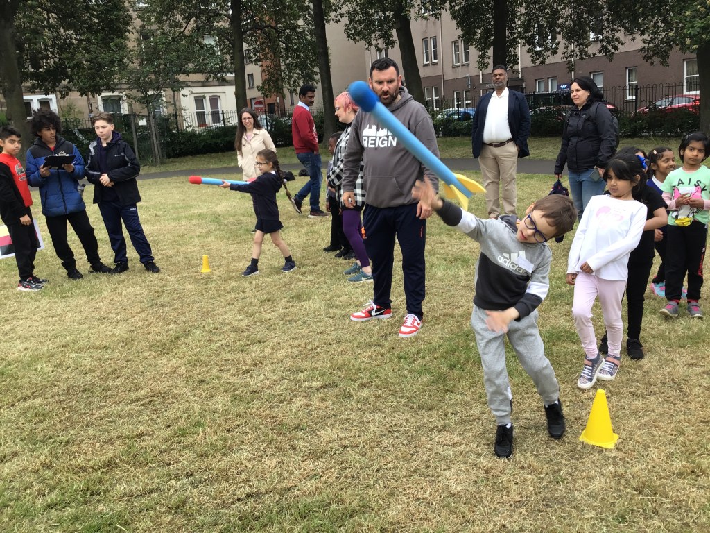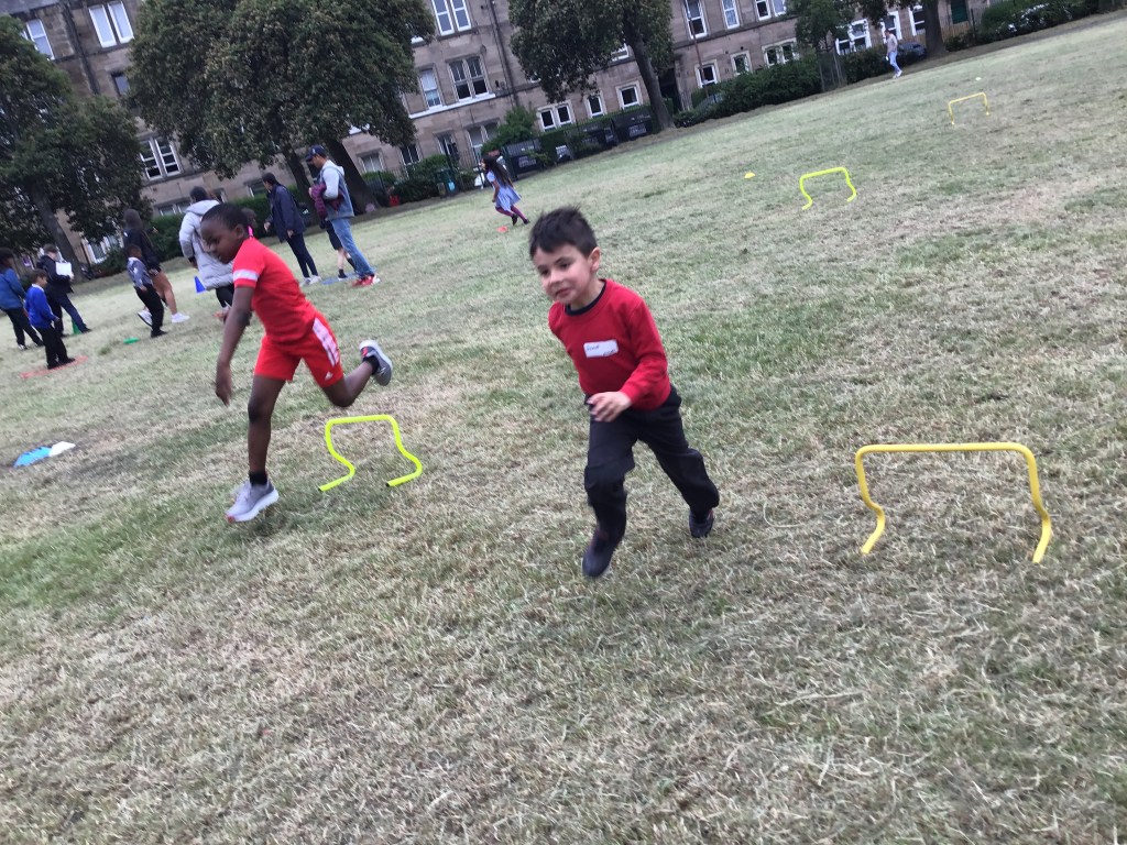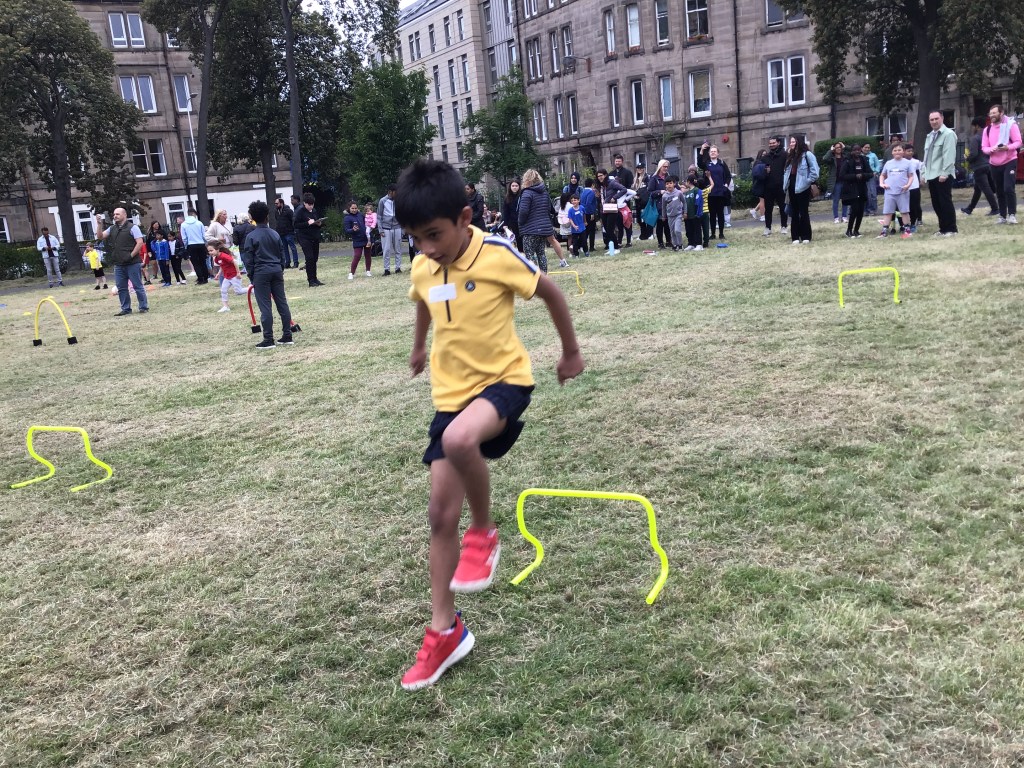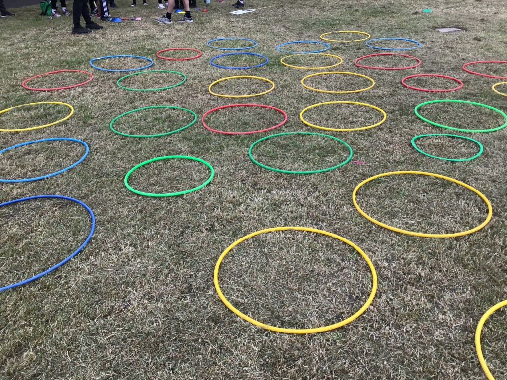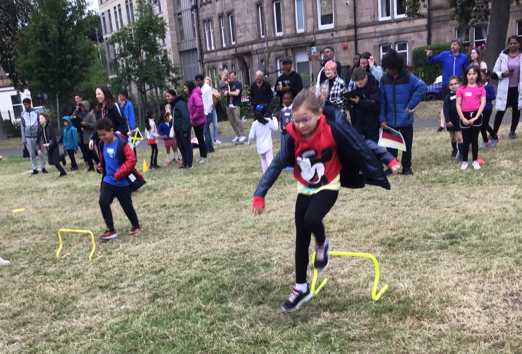 Our lower school went first split into country teams to try lots of stations with sports from football to Javelin. The sack race station was particular fun.
