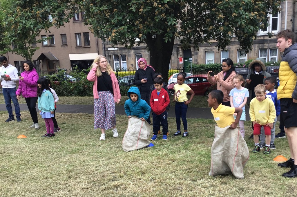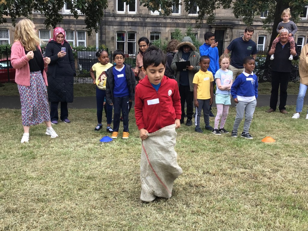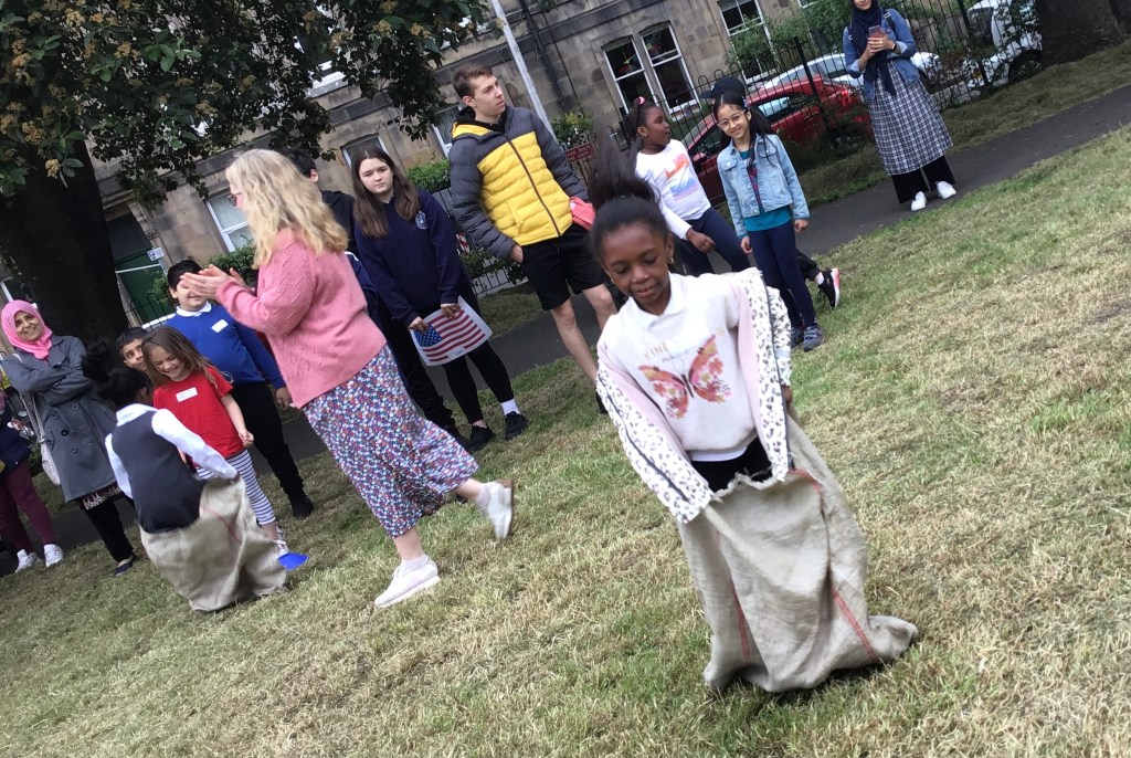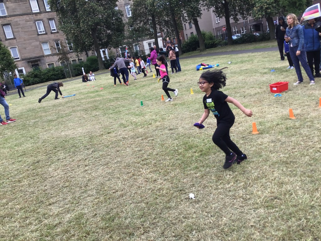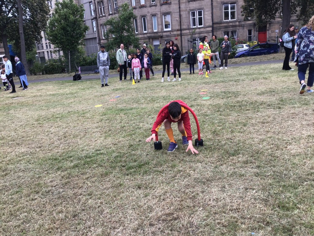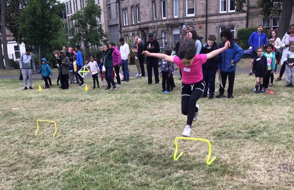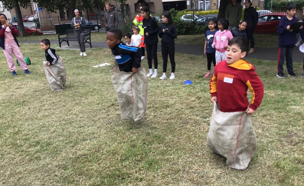 Our lower school went first split into country teams to try lots of stations with sports from football to Javelin. The sack race station was particular fun.