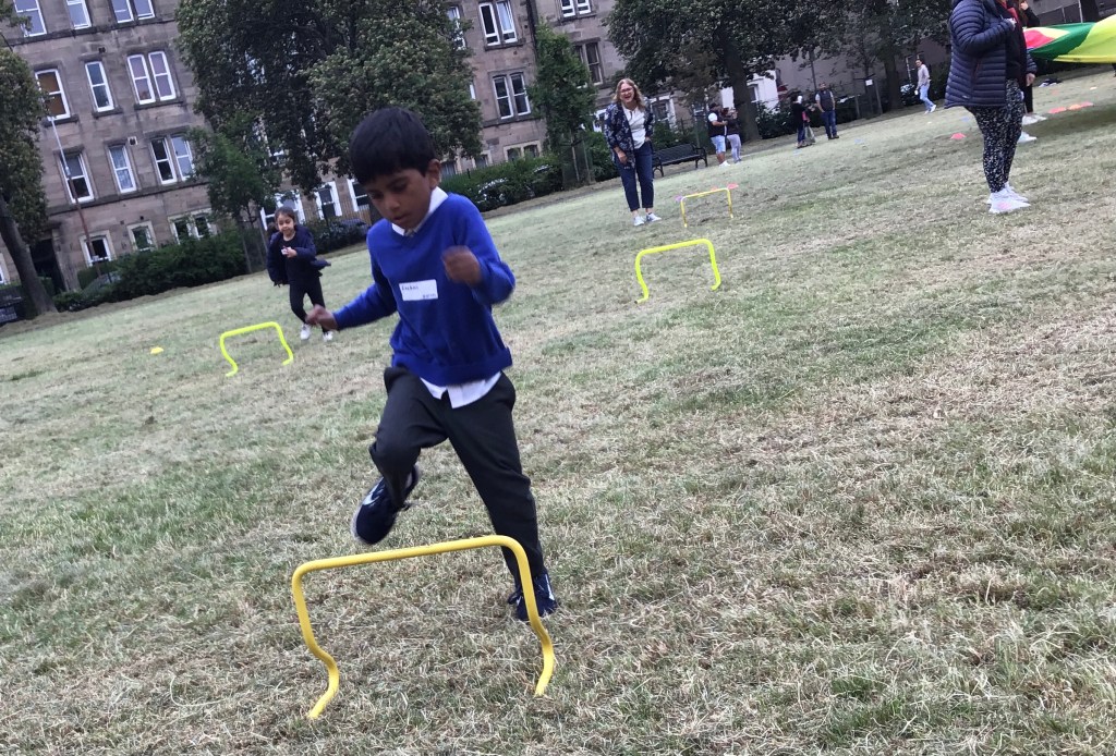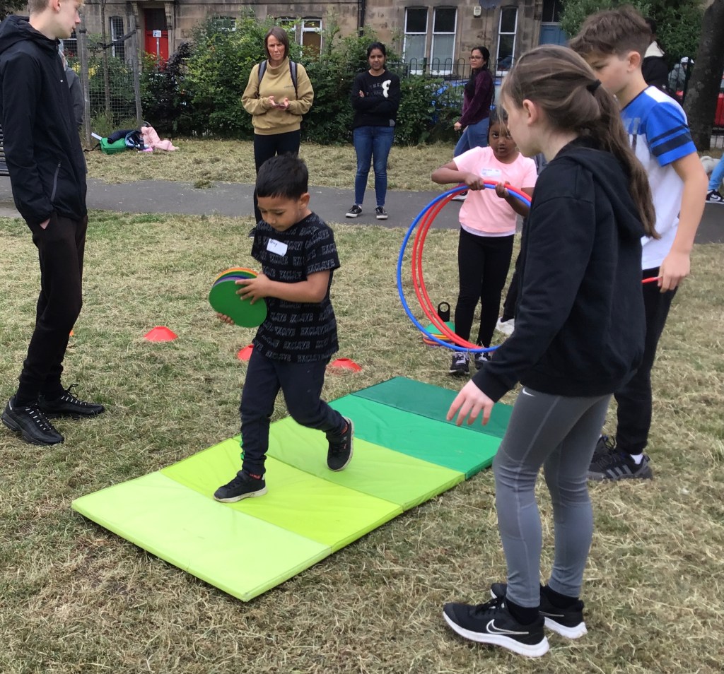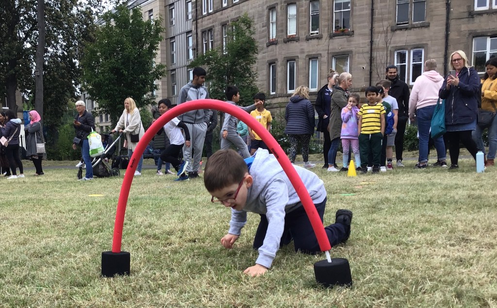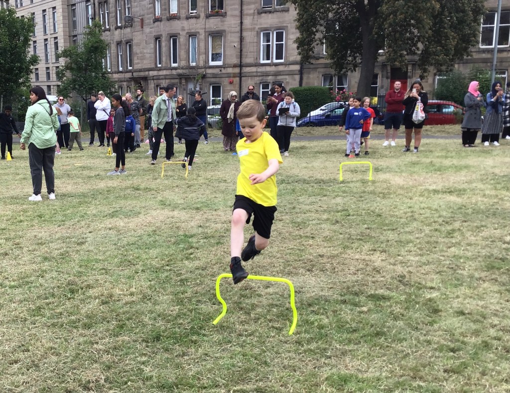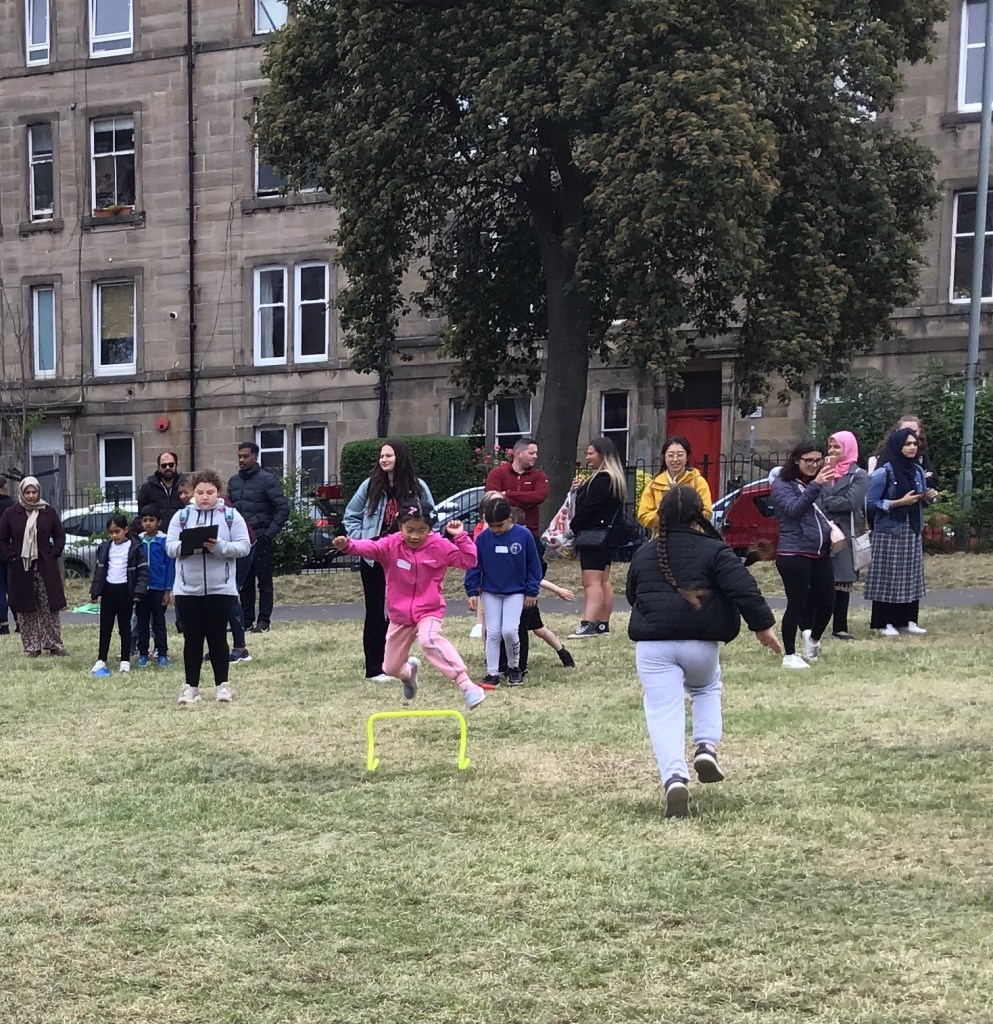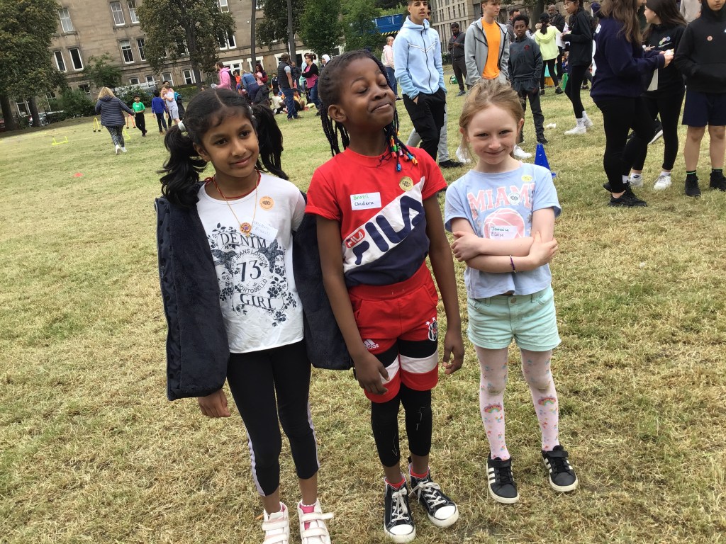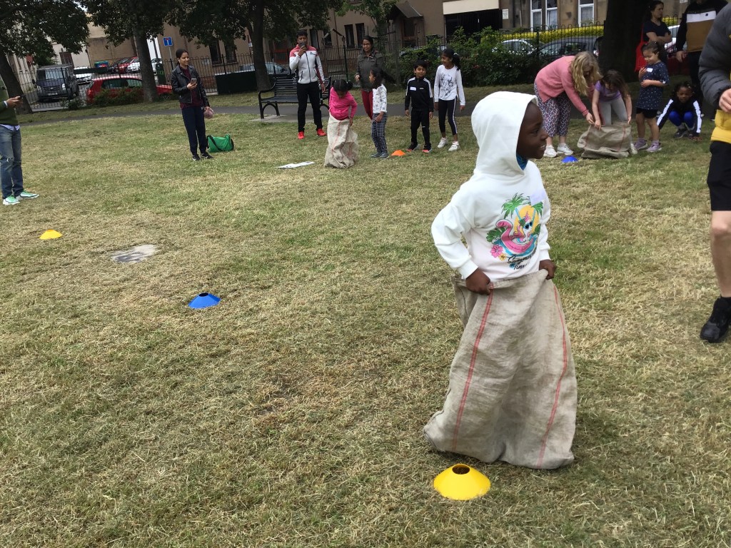 Our lower school went first split into country teams to try lots of stations with sports from football to Javelin. The sack race station was particular fun.