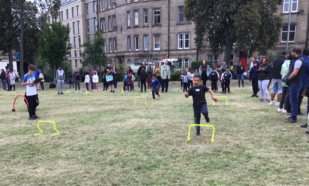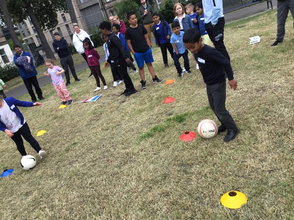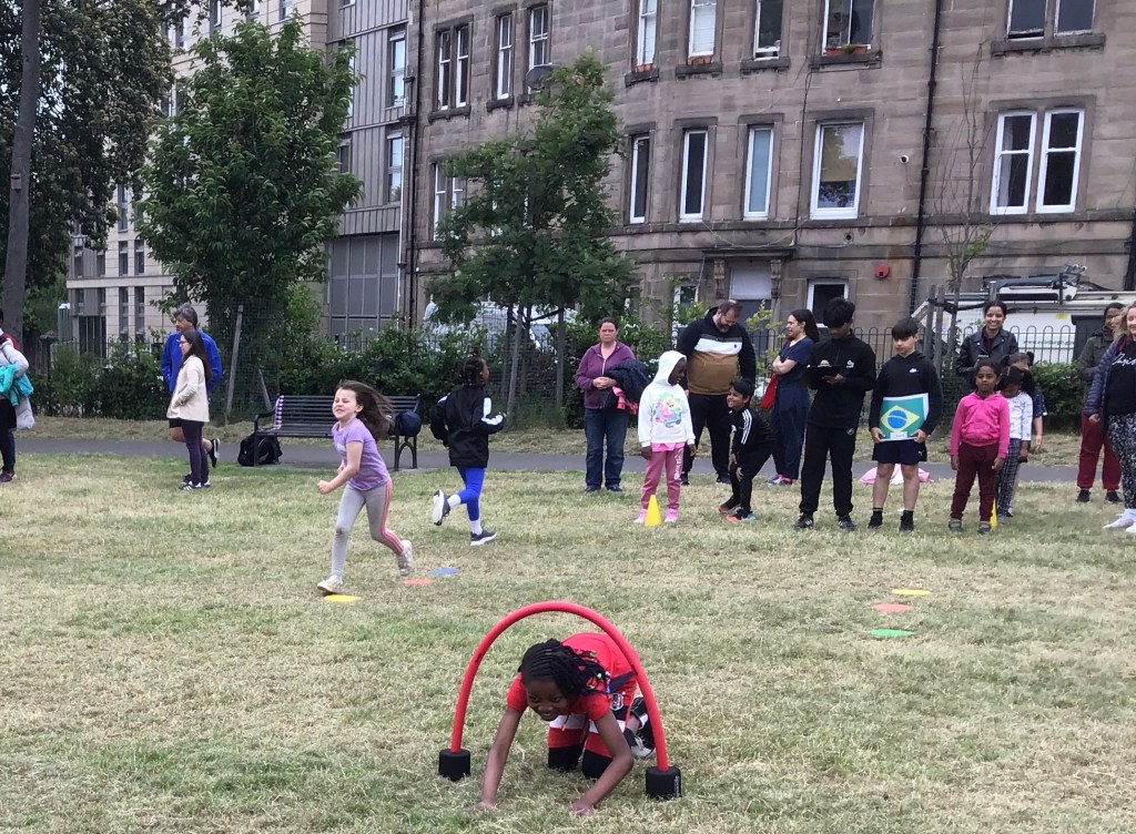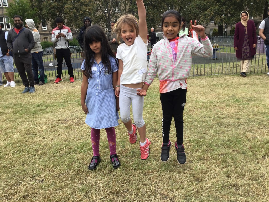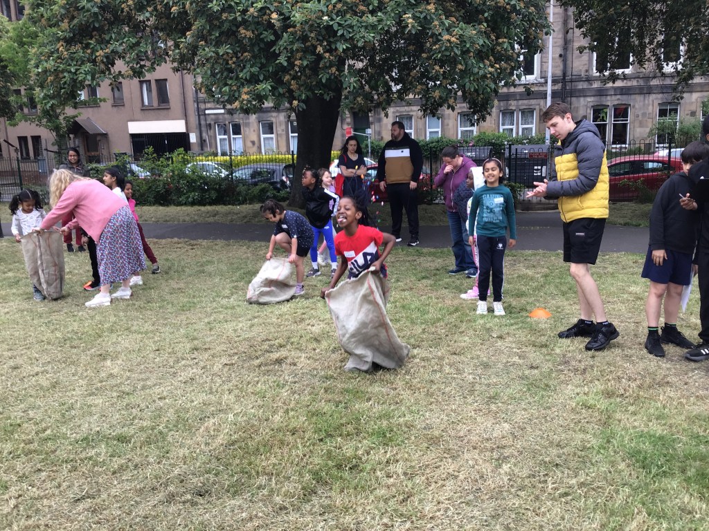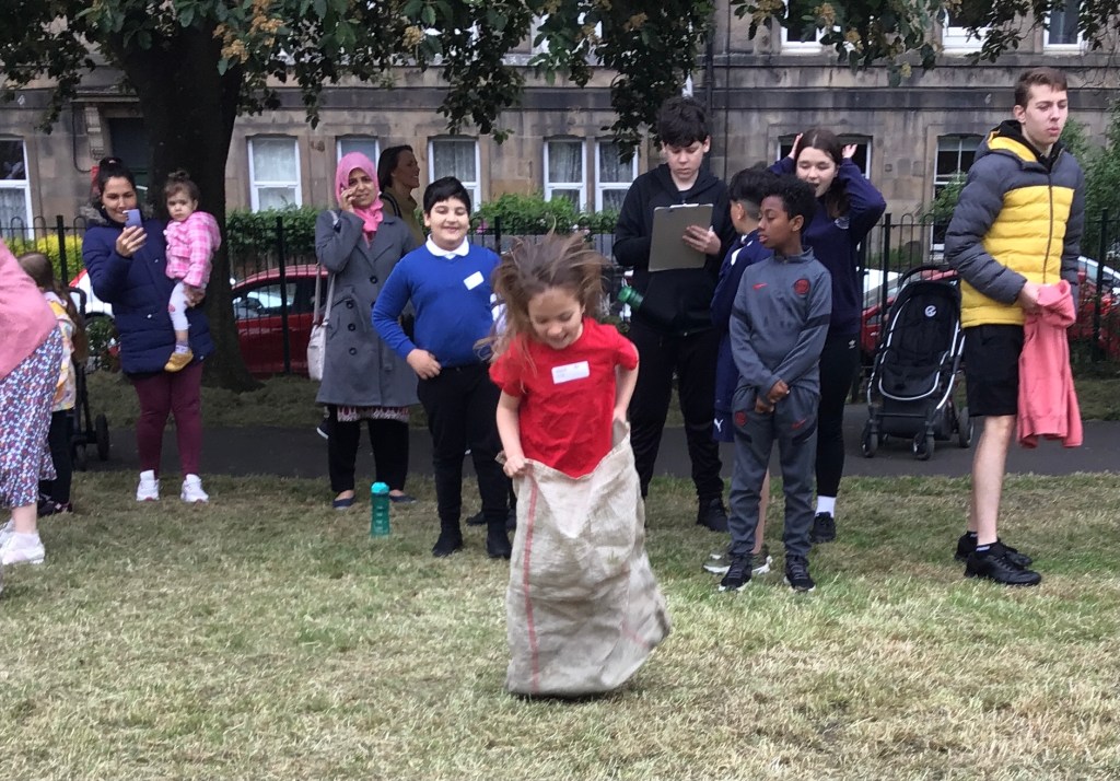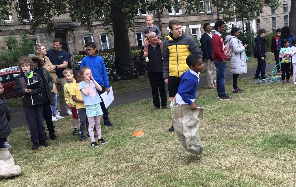 Our lower school went first split into country teams to try lots of stations with sports from football to Javelin. The sack race station was particular fun.
