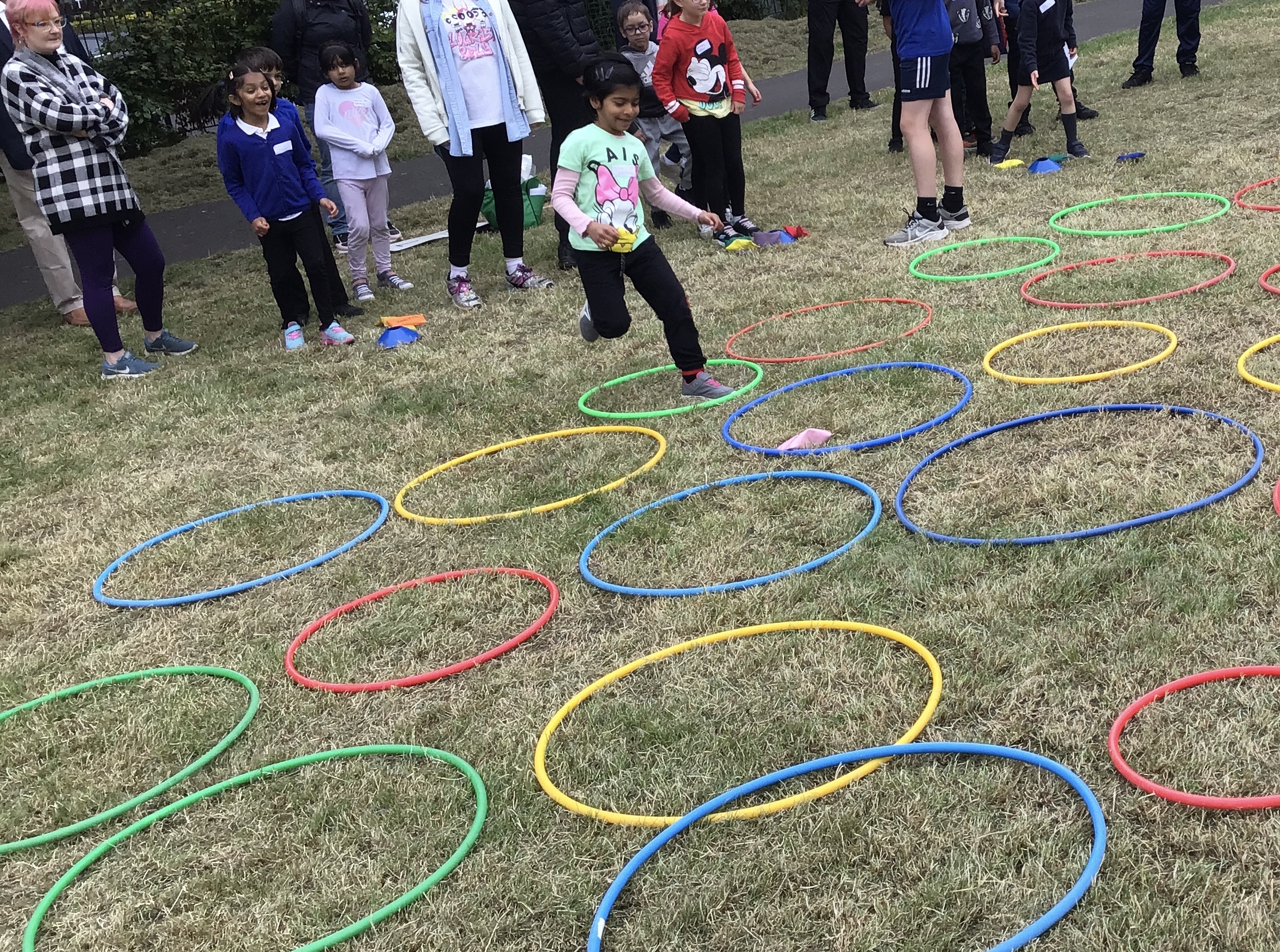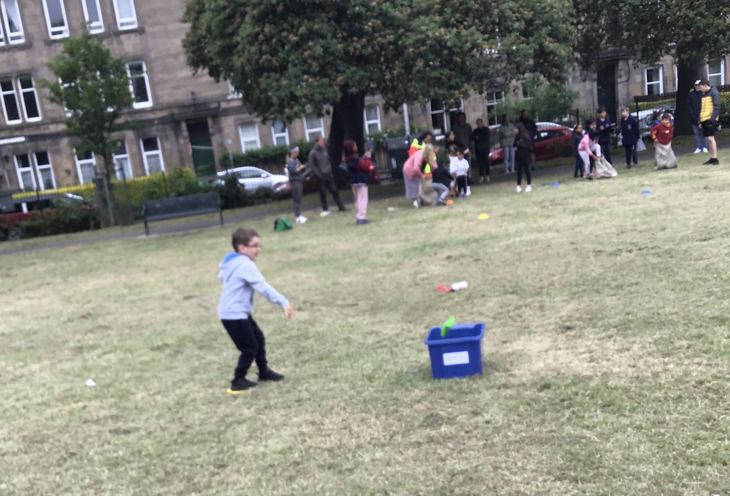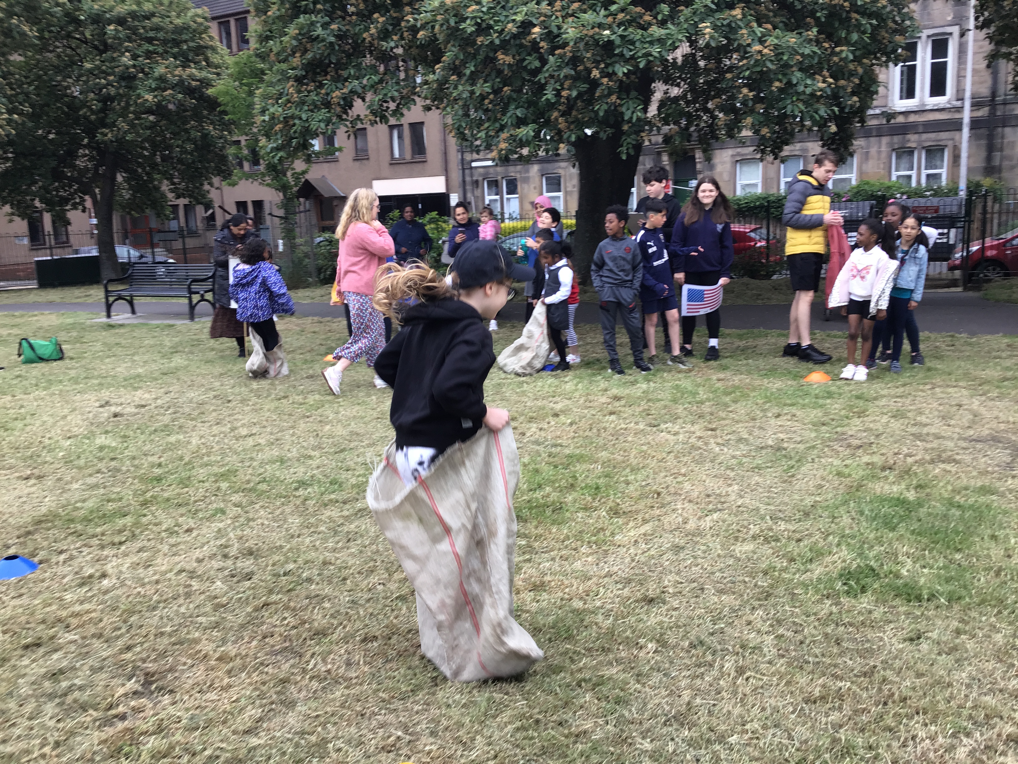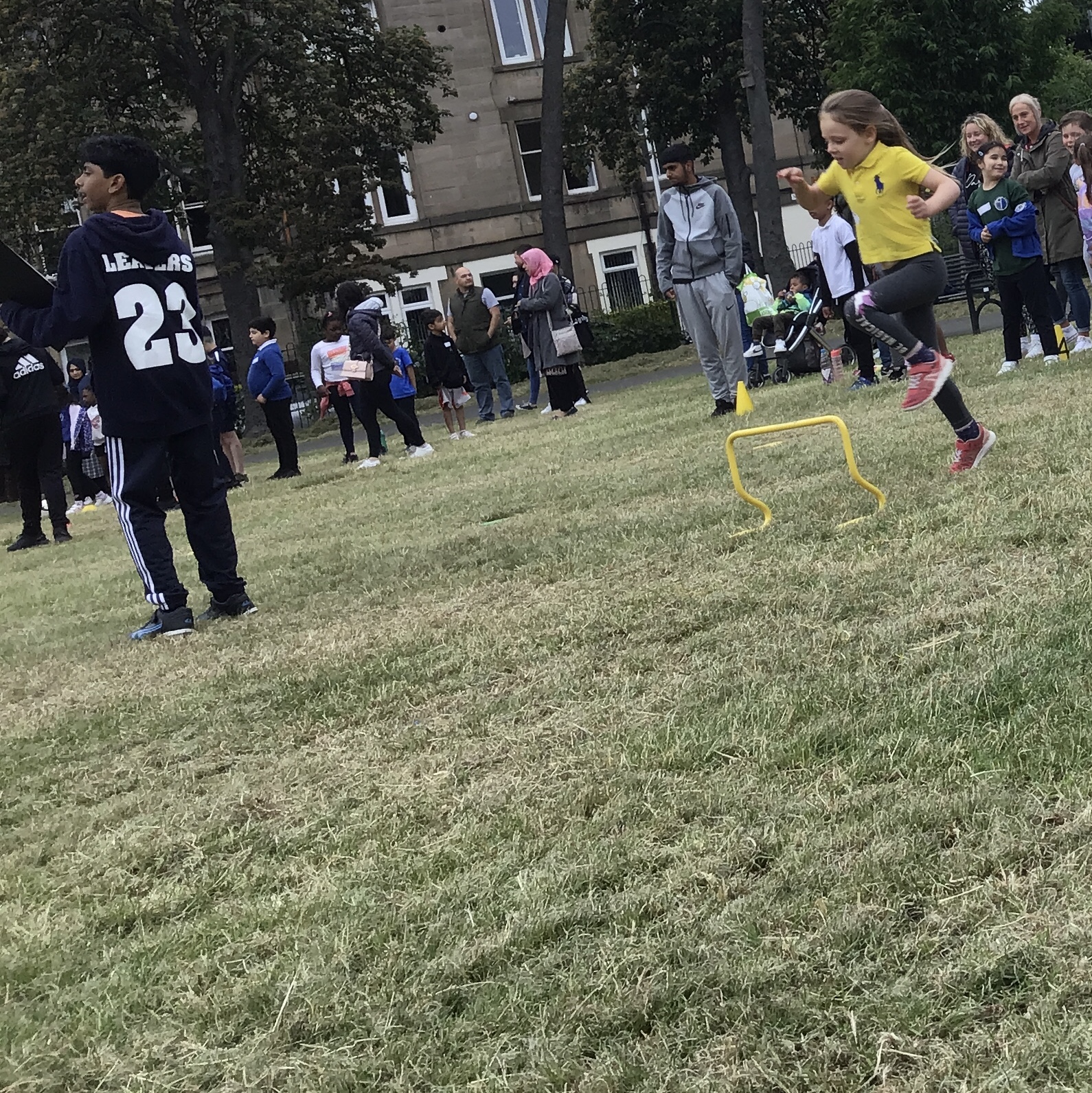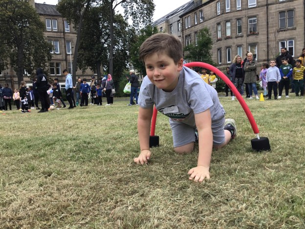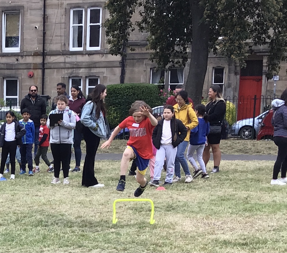 Our lower school went first split into country teams to try lots of stations with sports from football to Javelin. The sack race station was particular fun.