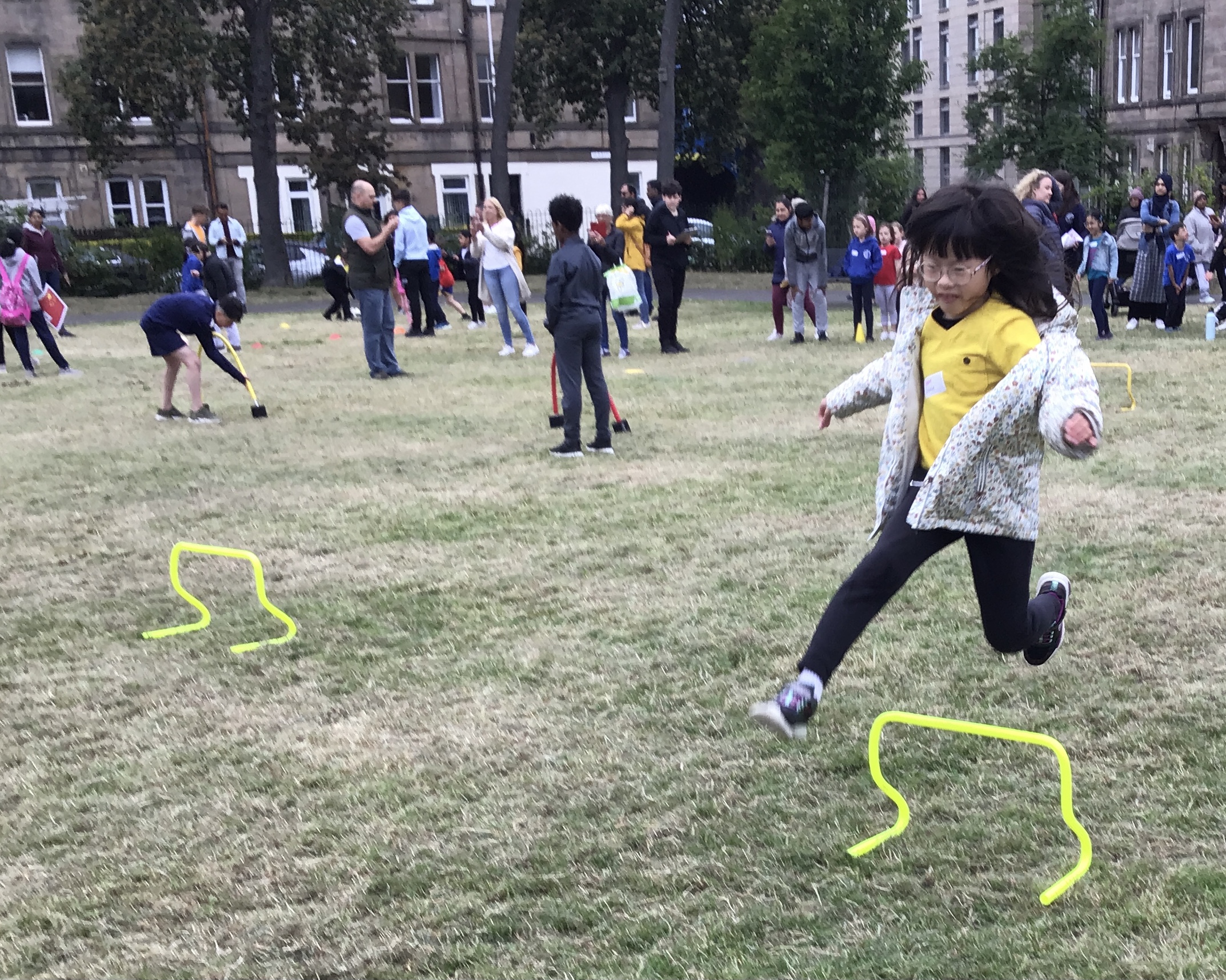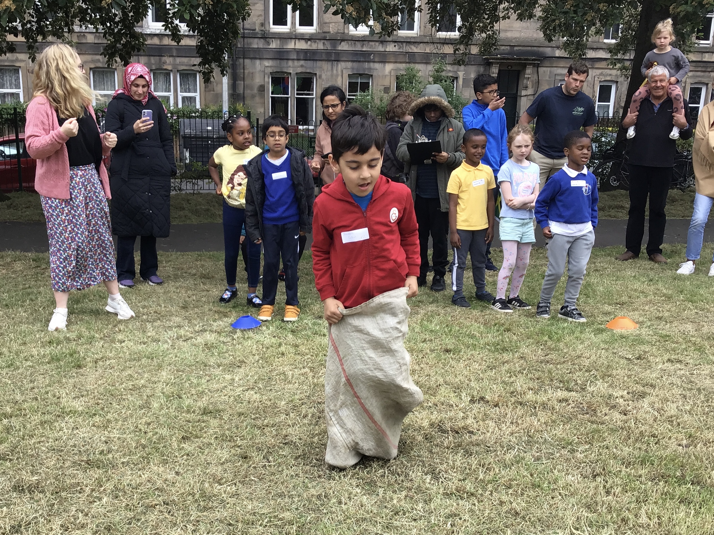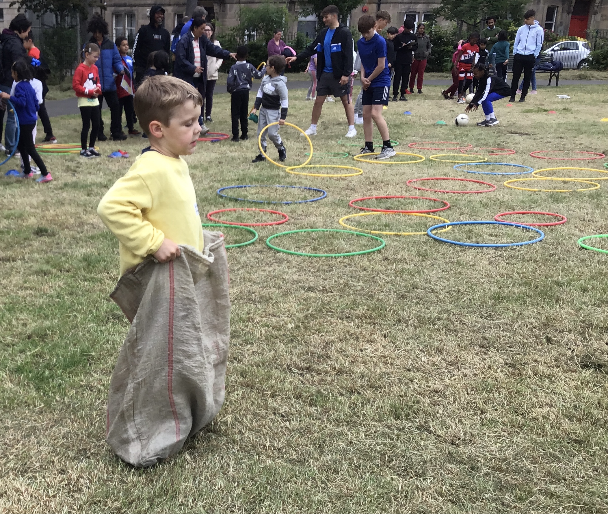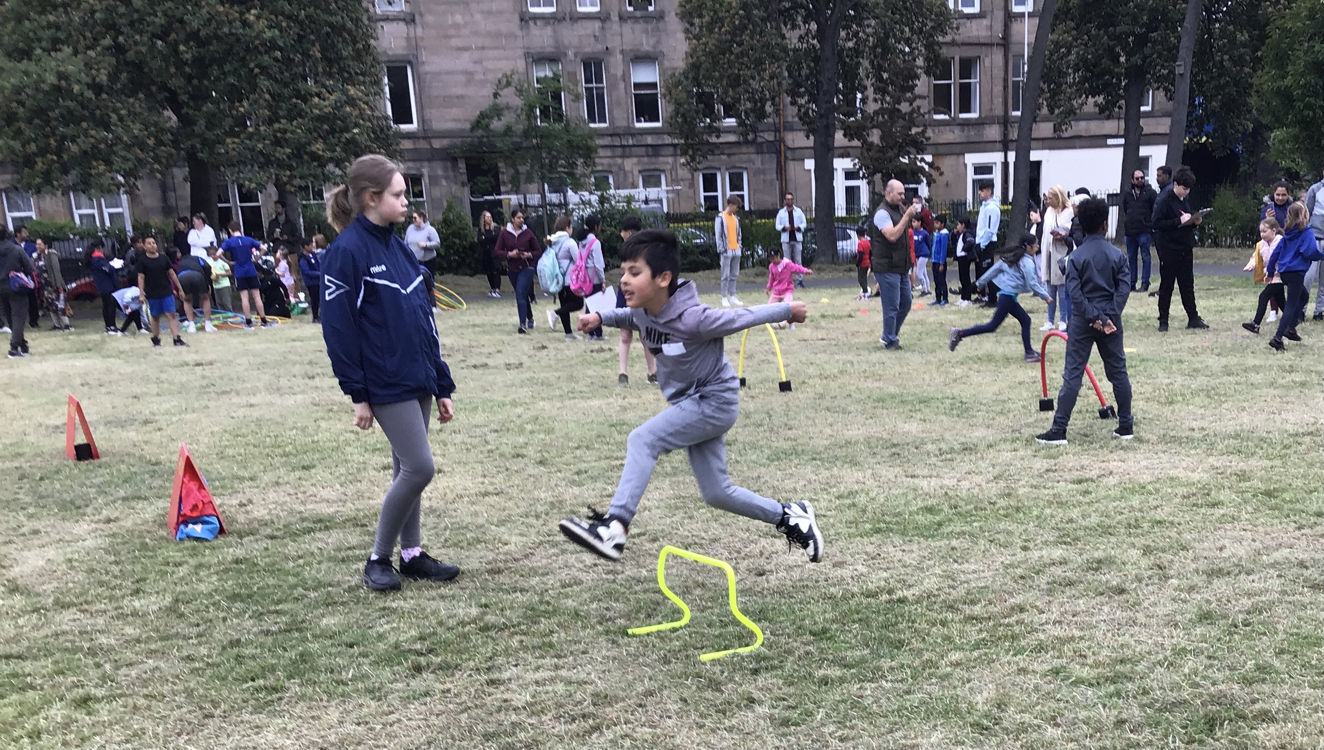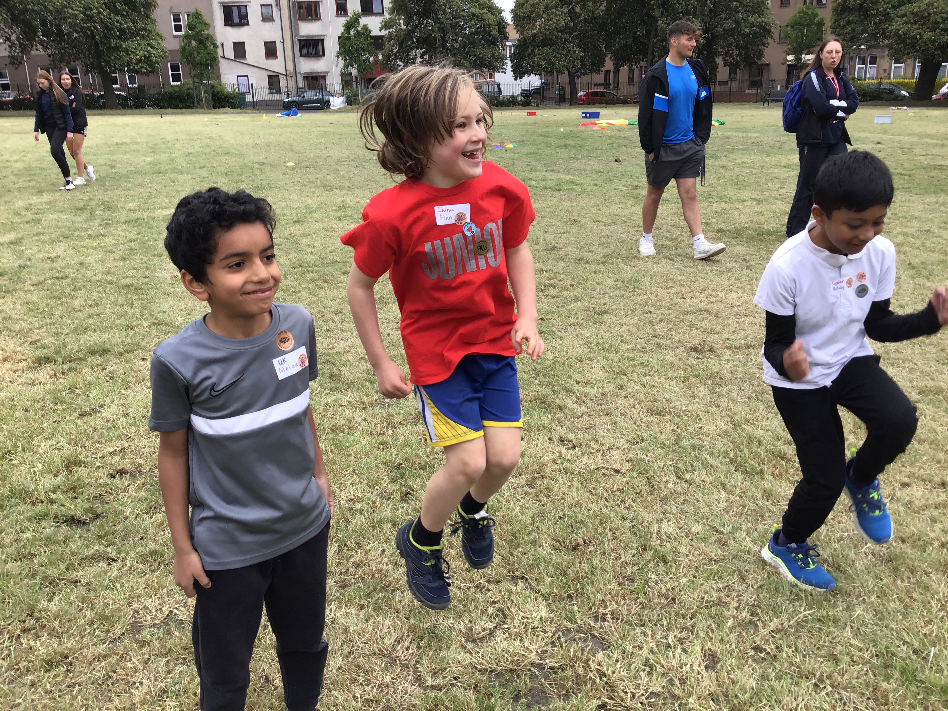 Our lower school went first split into country teams to try lots of stations with sports from football to Javelin. The sack race station was particular fun.
