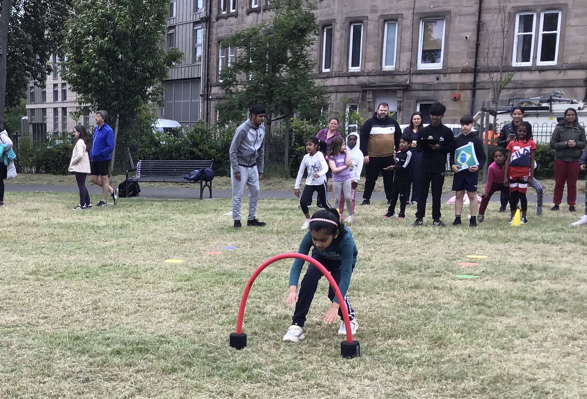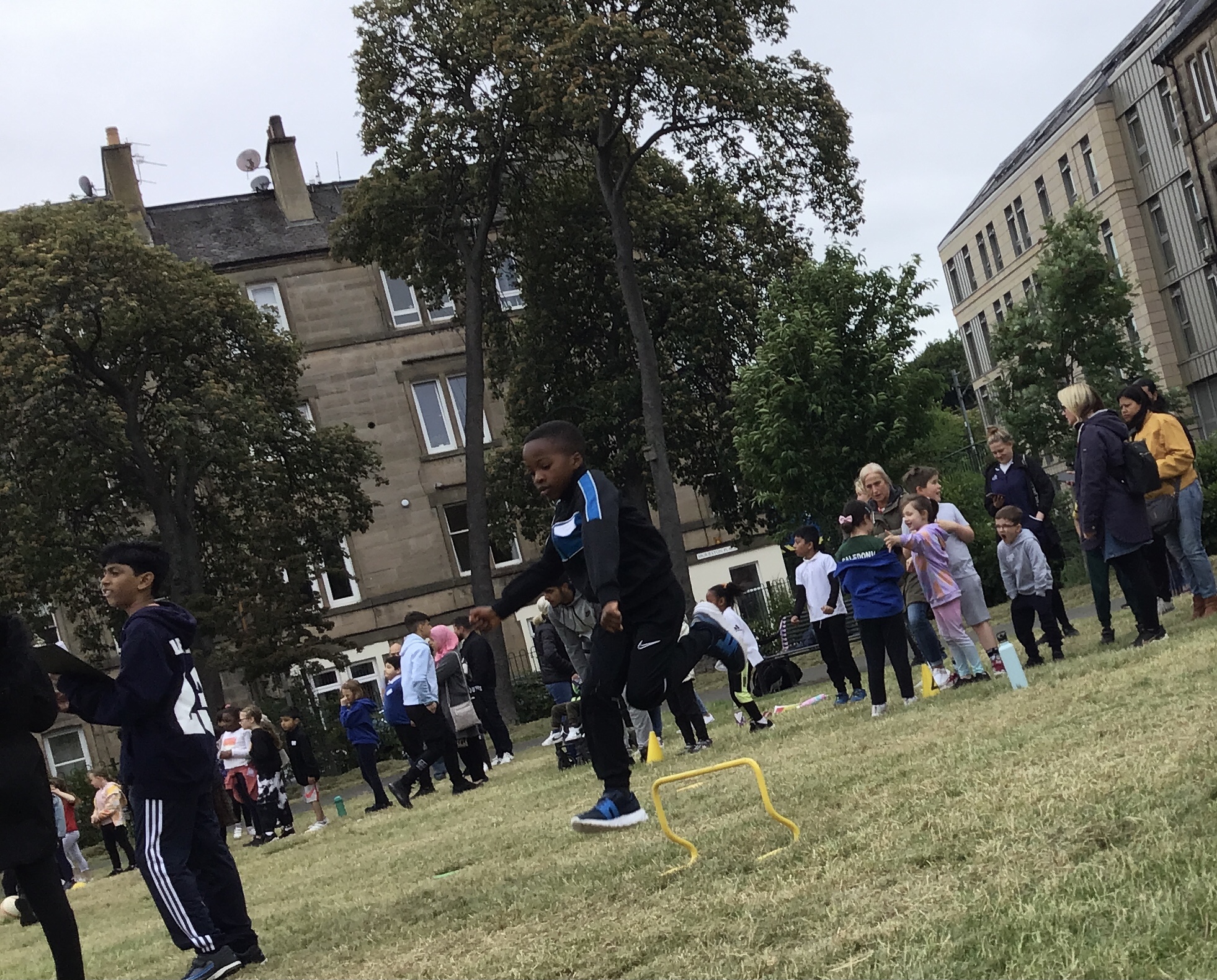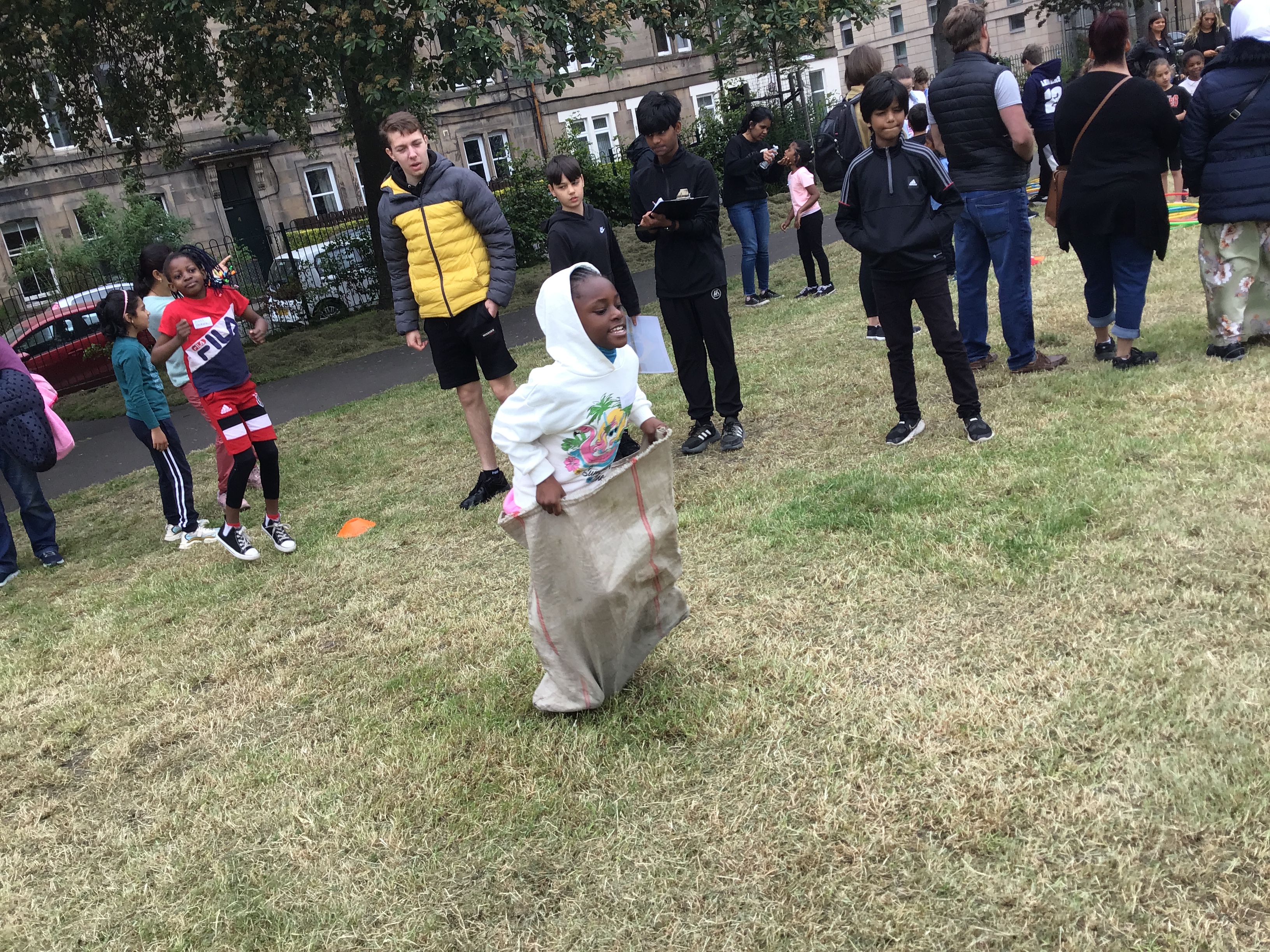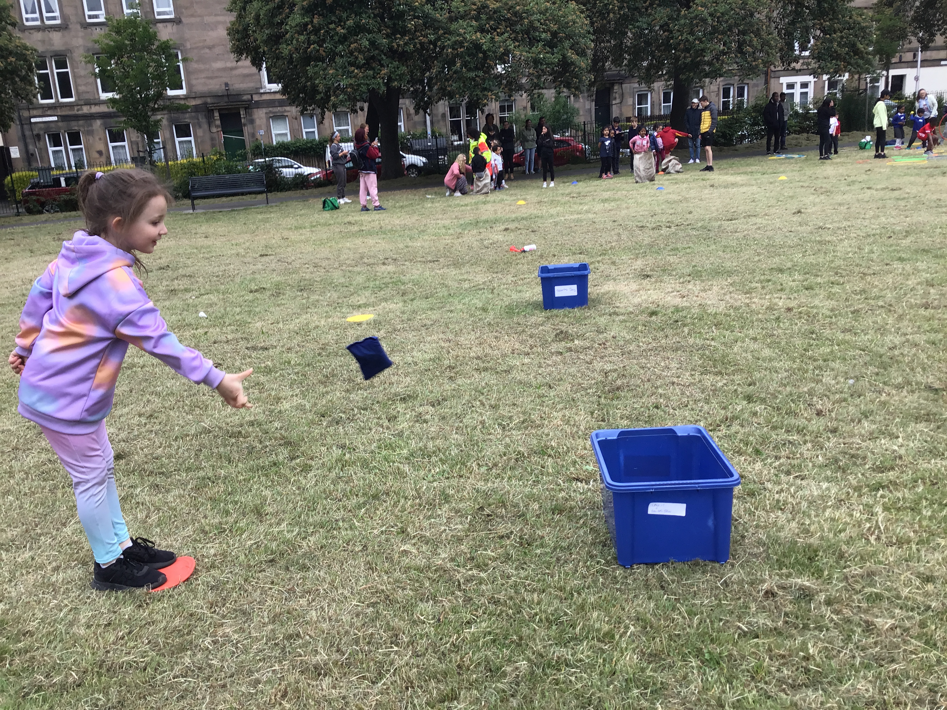 Our lower school went first split into country teams to try lots of stations with sports from football to Javelin. The sack race station was particular fun.