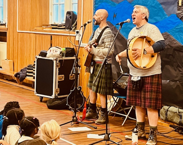 We had a brilliant start to our whole school Scots week with an assembly with ‘The Sorries’. We all enjoyed performances of poetry by P6 and P7 as well as lots of energetic music and song from Marty and Douglas. We were joined by our older nursery pupils who will be moving onto P1 in August too. Next week we will look forward to performances from P1 to P5/6.